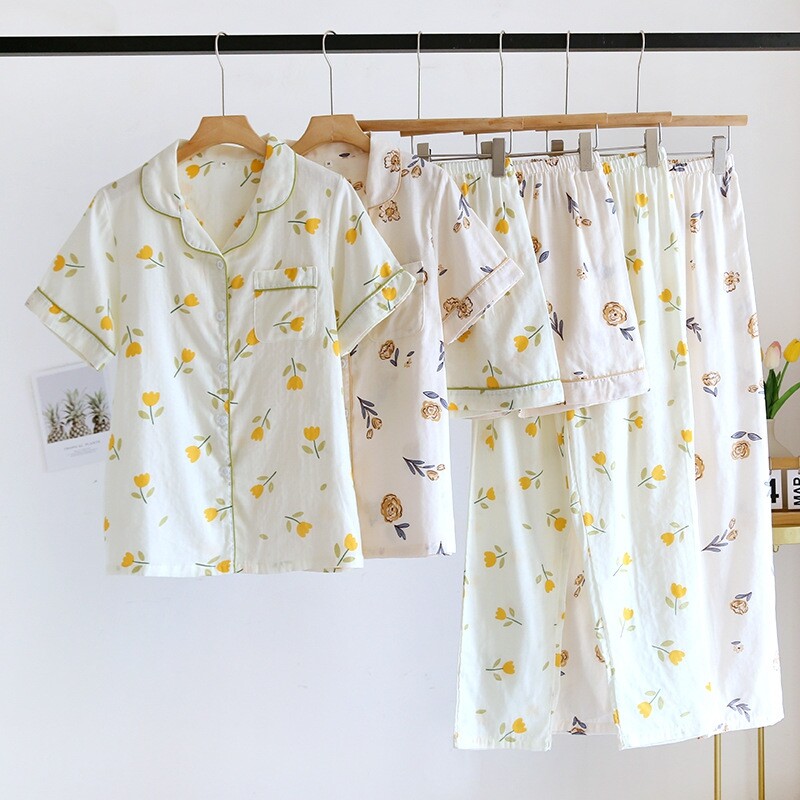 3PCS Women Pajamas Set 100% Gauze Cotton Printed Pyjamas Short Sleeve Sleepwear