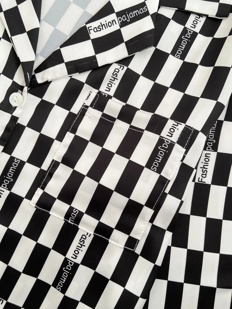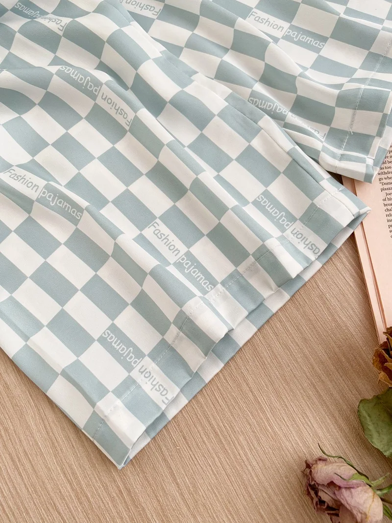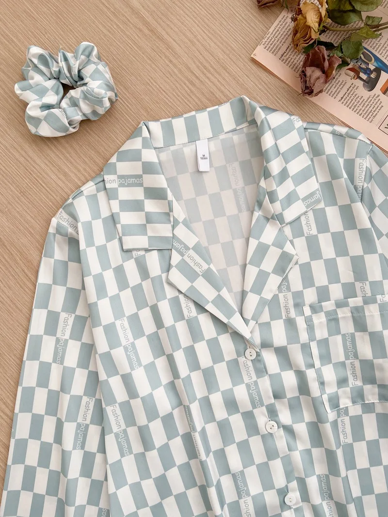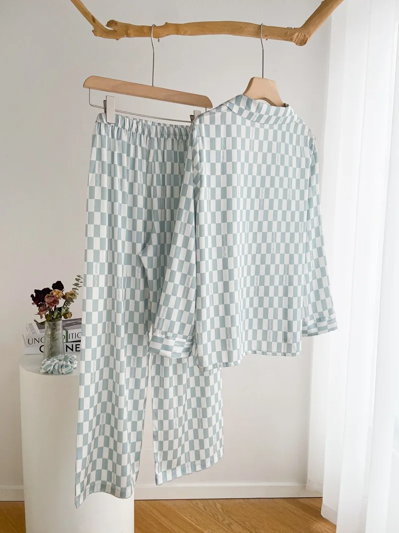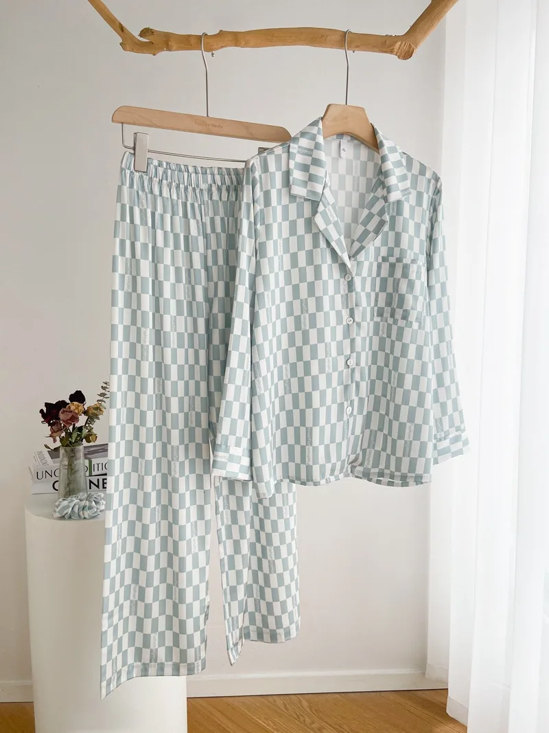Sleepwear Two-Piece Set Elegant Print Plaid LongSleeve PijamasSuit Spring Summer