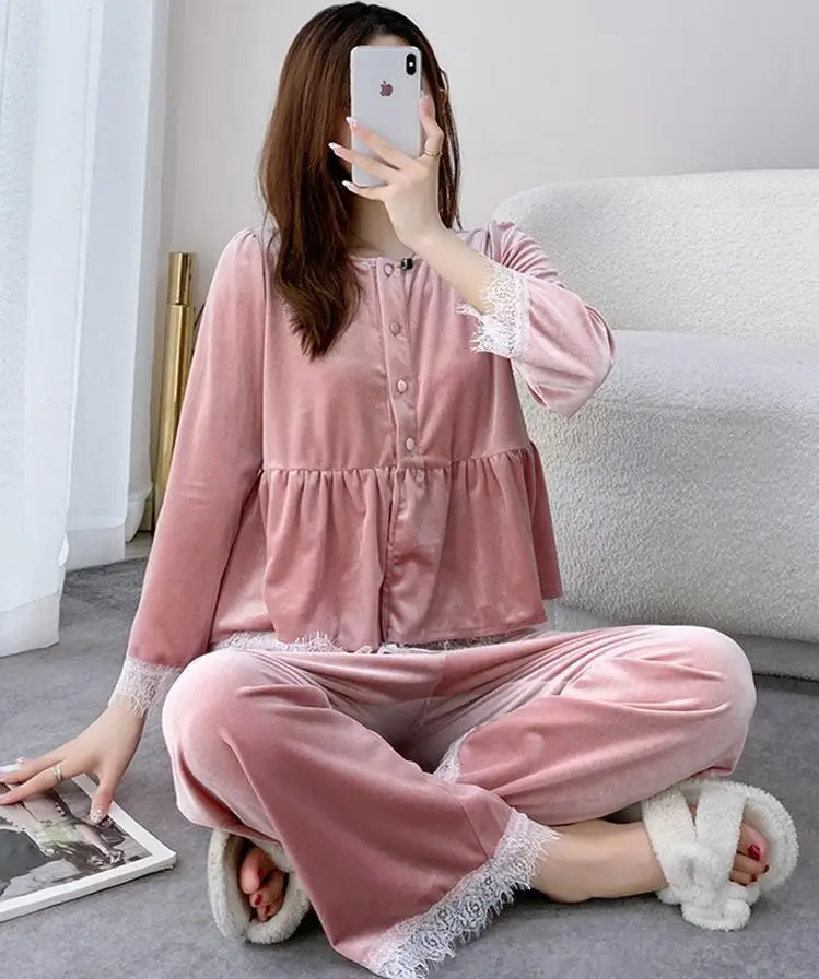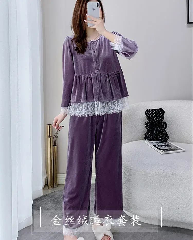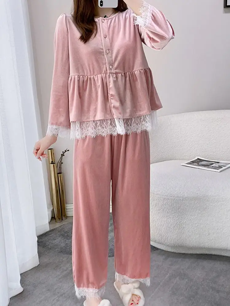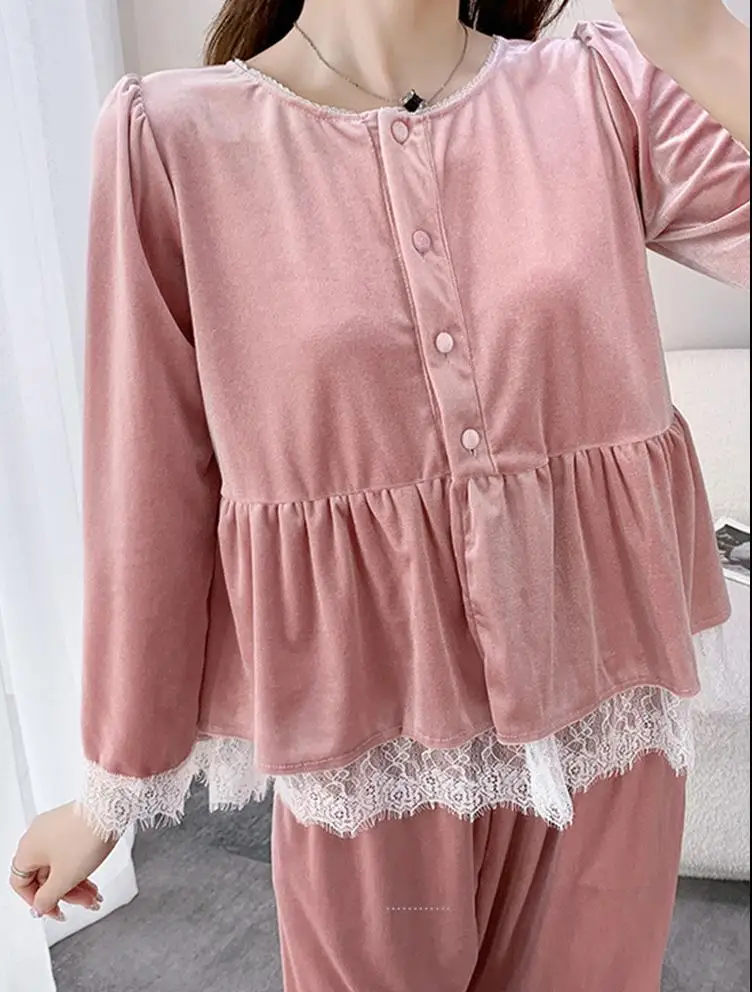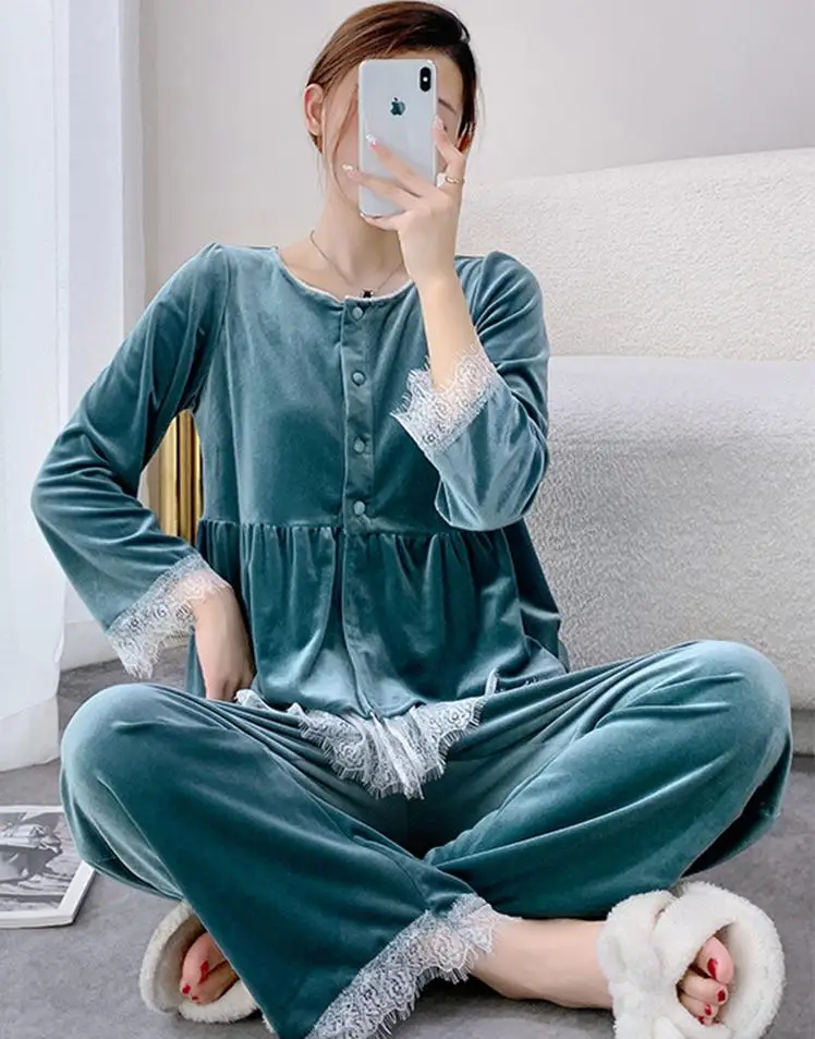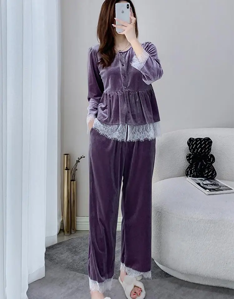Velvet Pajamas Suit V-Neck 2PCS Set Women Lace Sleepwear Button-down Nightwear