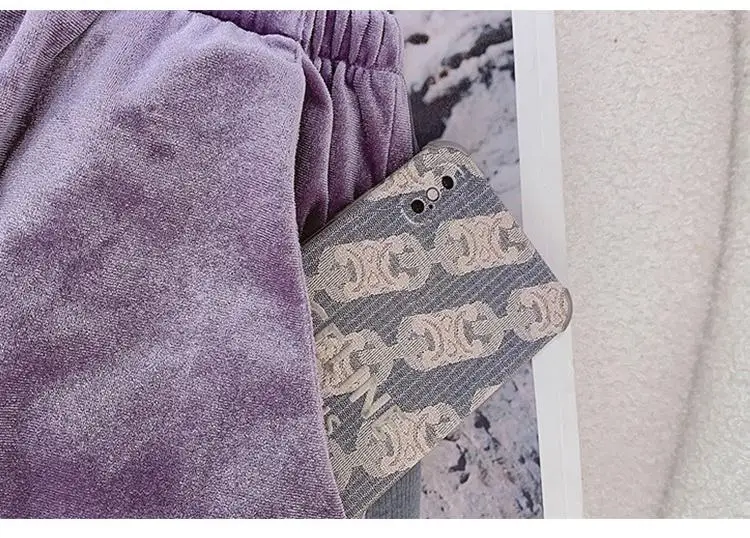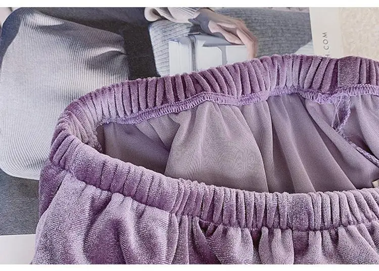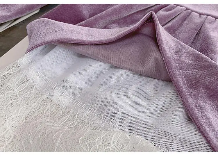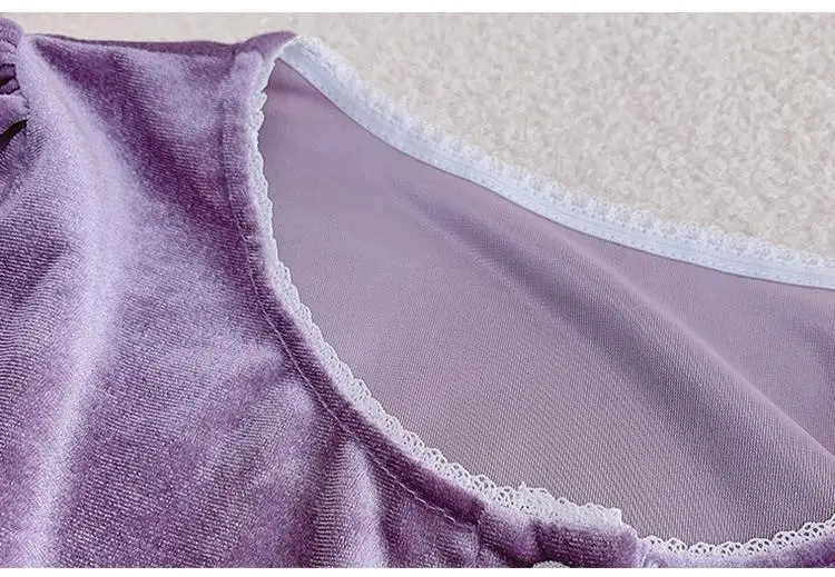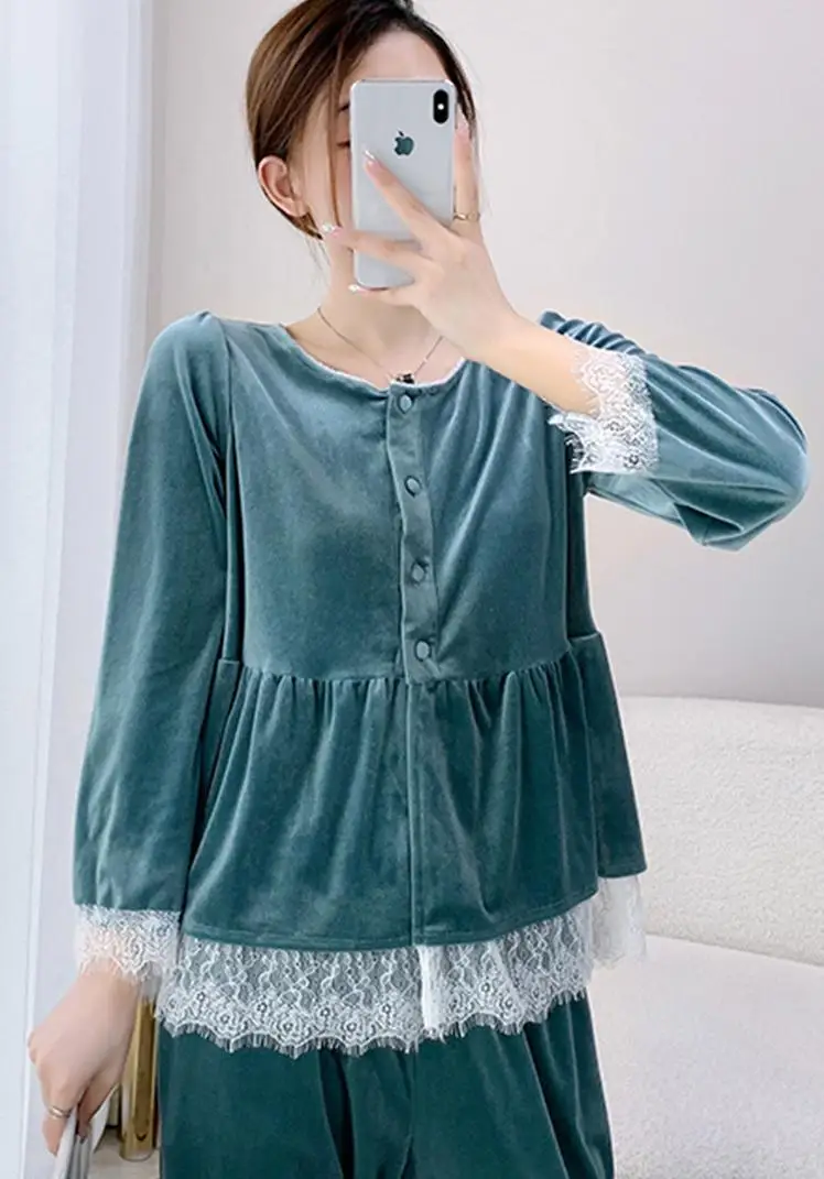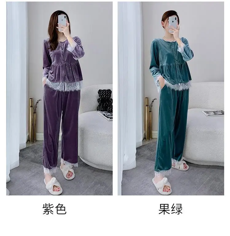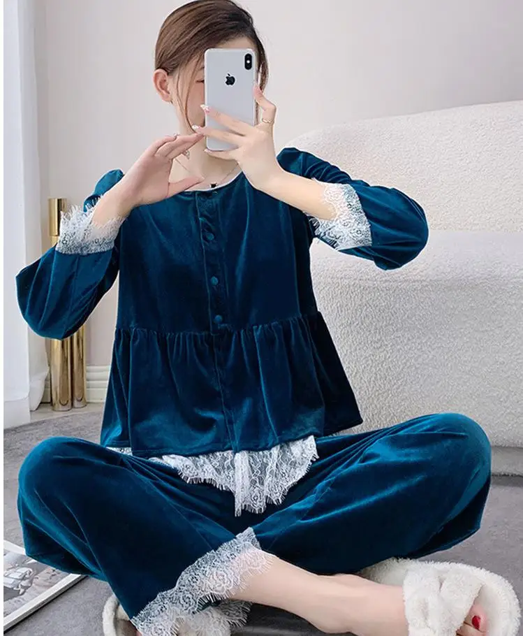 Velvet Pajamas Suit V-Neck 2PCS Set Women Lace Sleepwear Button-down Nightwear