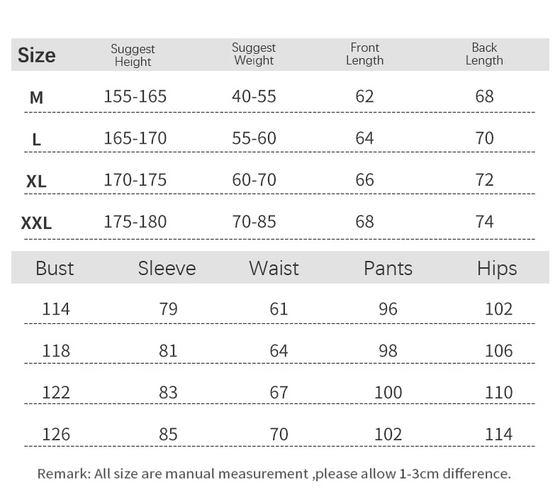 M: Height 155 cm - 165 cm; Weight 40kg - 55kg;
