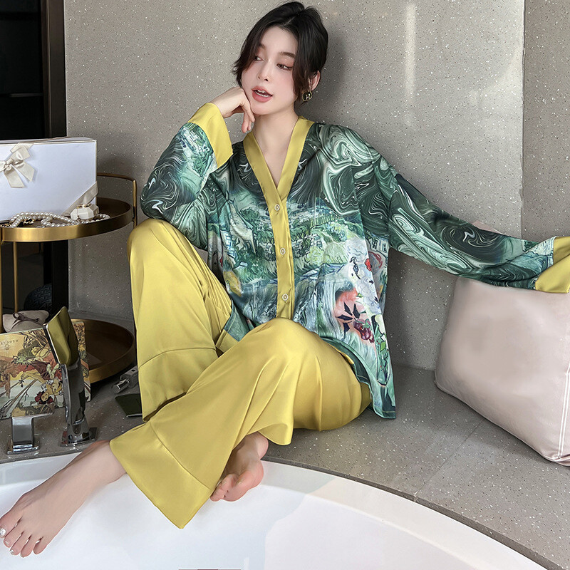 Women's Pajamas Set Luxury Print Silk Sleepwear V Neck Design Homewear Nightwear