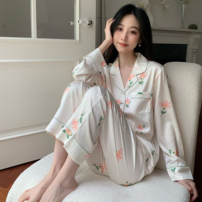 Women Silk Satin Pajamas Long Sleeve Sleepwear 2-piece Button-Down Home Wear Pjs